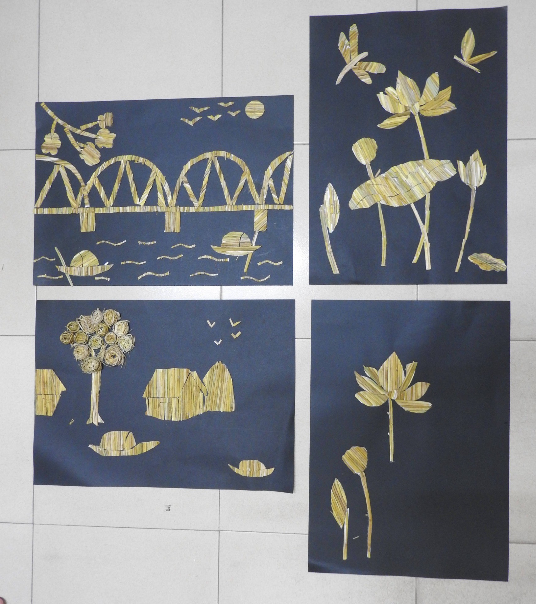 生徒たちは、わらについて学ぶことに大興奮でした。ほとんどの生徒たちは、日常生活でわらに触れる機会がなかったからです。子どもたちは、グループで熱心に作業し、協力して美しい絵を一緒に描きました。